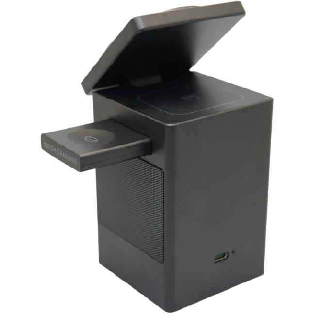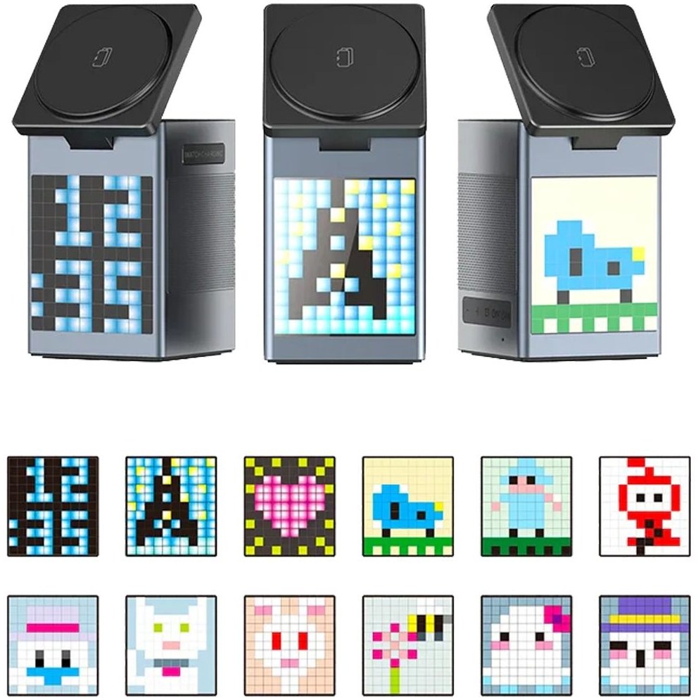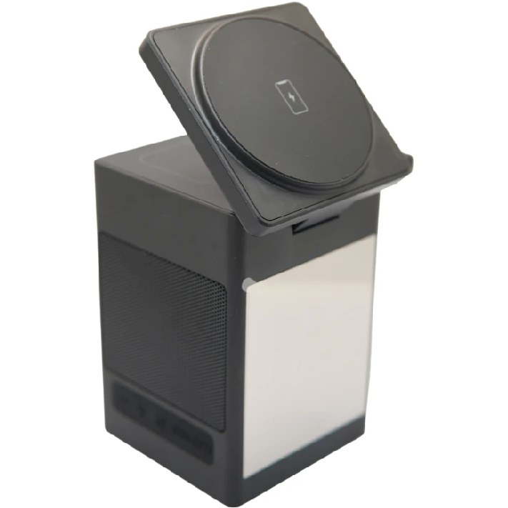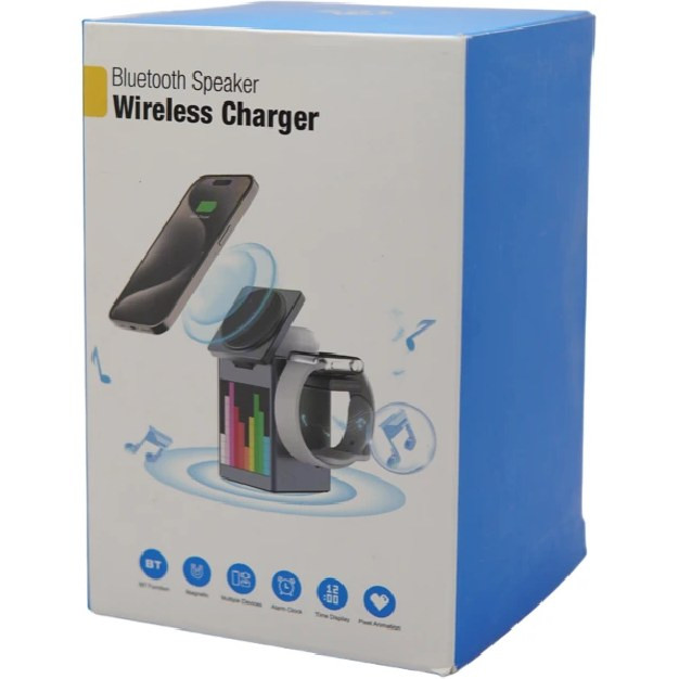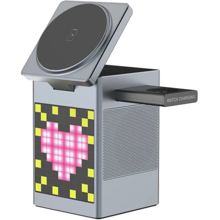 شارژ سه دستگاه بصورت همزمان با حداکثر توان 18 وات | شارژ ساعت هوشمند، گوشی هوشمند و ایرپاد بصورت همزمان | شارژ گوشی با توان 15 وات، ساعت هوشمند با توان 2.5 وات و ایرپاد با توان 5 وات | اسپیکر قدرتمند برای پخش موزیک | بلوتوث نسخه 5.3 | صفحه نمایش پیکسلی برای نمایش ساعت و نورپردازی هنگام پخش موزیک | امکان استفاده به عنوان زنگ هشدار